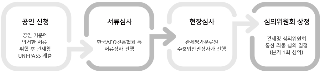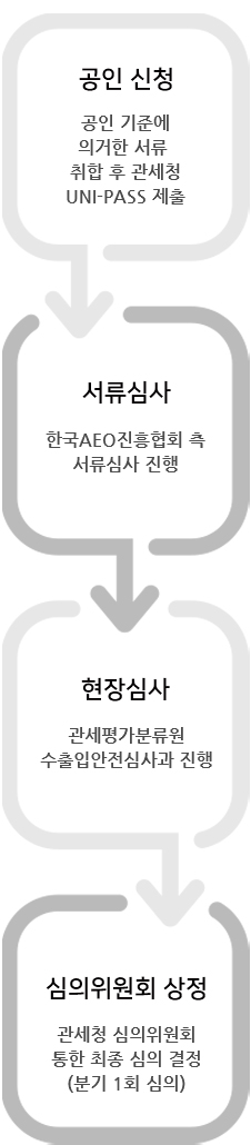 | 공인취득 준비 및 신청 | * AEO 공인 기준에 의거하여 각 기준 별 자료 준비 및 관세청 UNI-PASS 통한 전자제출 |