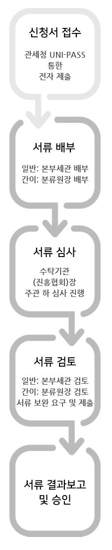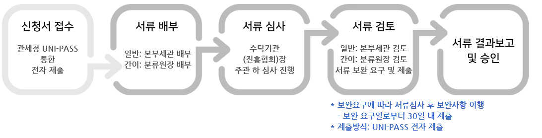 | 서류심사 보완제출 | * [AEO고시 ; 제8조 ; ②항]에 따라, 보완 요구일로부터 30일 내 보완 제출 必 |