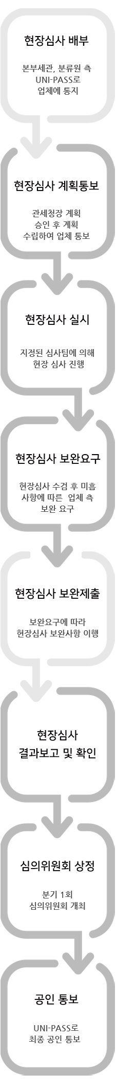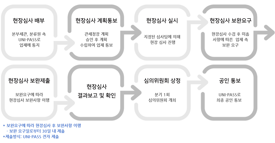 * 서류심사 보완 제출 후 결과보고 완료 시 현장심사 대상업체 선정 확인 가능(관세청 UNI-PASS 內 ‘신청서 처리현황‘ 확인 가능) * 현장심사 수검 전까지 각 관련 서류 점검 및 심사 대응 준비(현장심사 개시 10일 전 계획 통지 예정) |